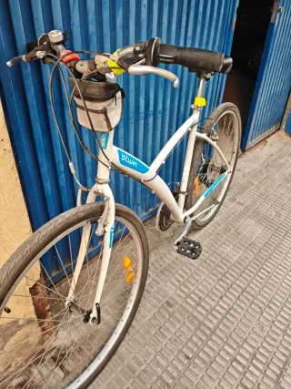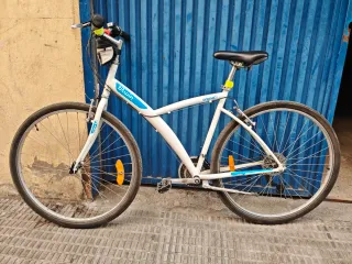 Bicicleta Btwin en color blanco, ideal para paseos. - Cuadro de aluminio. - Ruedas de 29 pulgadas. - Frenos V-brake. - Sillín cómodo. Bicicleta muy cómoda y suave. Lleva tiempo parada pero está en perfectas condiciones. Muy muy poco uso y puesta a punto. Todo funciona a la perfección, cambio frenos, dirección etc.