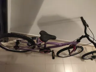 Bicicleta de montaña B-Twin ideal para dar paseos por el campo.Es talla S -Seis cambios a la derecha de manillar y tres a la izquierda -Tiene amortiguación en la rueda delantera - Sillin ajustable Esta en perfecto estado aunque tiene barro en las ruedas, en los cambios y en los cassetes, anteriormente hubo un problema con el freno trasero pero la llevé a reparar.Si tienes alguna duda no dudes en preguntar