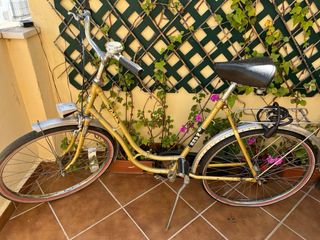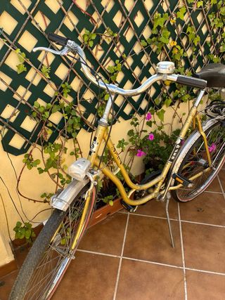 Bicicleta clásica de color dorado en buen estado. Ideal para paseos cortos. - Modelo antiguo, con detalles estéticos únicos. - Incluye guardabarros y portaequipajes. - Lista para usar.