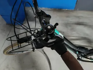 Bicicleta de paseo en color negro con detalles en verde turquesa. Ideal para desplazamientos urbanos, muy poco uso - Cuadro bajo de aluminio. - 7 velocidades. - Ruedas de 28 pulgadas. - Cesta delantera. - Portabultos trasero. - Cambios Shimano.