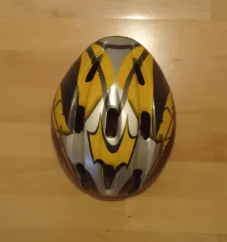 Casco de bicicleta con un diseño llamativo en amarillo y detalles plateados. Ideal para proteger en tus paseos. Talla 47-54 cm - Diseño con ventilación. - Acabado brillante. *SOLO VENTA EN MANO EN ZARAGOZA*