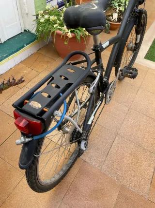 Bicicleta de montaña Rockrider ST 540 en color negro y detalles en rojo. Ideal para senderos y rutas. - Cuadro de aluminio. - Frenos de disco hidráulicos. - Suspensión delantera. - Ruedas de 27.5 pulgadas. - Cambio de marchas Shimano. - Parrilla trasera - Luz trasera - Guardafangos largo - Sillín ancho de gel ( sillín pequeño también incluido) - Candado de seguridad con tres llaves - Casco - Repuesto de neumático - Bomba de aire - Adaptador para móvil TODOS LOS ACCESORIOS SON NUEVOS Y ESTÁN INCLUIDOS