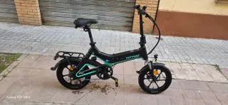 Bicicleta eléctrica plegable de la marca Hitway, con un diseño moderno y funcional. - Color principal negro con detalles en verde azulado. - Marco plegable para facilitar su transporte y almacenamiento. - Ruedas de tamaño compacto. - Sillín y manillar ajustables.
