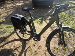 Bicicleta eléctrica de color verde oscuro, ideal para desplazamientos urbanos. - Cuadro de aluminio. - Ruedas de 700c. - Frenos de disco. - Cambio Shimano. - Motor en rueda trasera. - Batería integrada. -autonomía de batería hasta 70 km