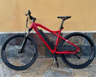 Bicicleta eléctrica Rockrider eST100 en color azul. - Cuadro de aluminio. - Ruedas de 27'5 pulgadas. - Frenos de disco hidráulicos. - Motor eléctrico 380Wh 3 velocidades . - Batería de larga duración. -Dirección ajustable -Canvio de 8 piñones -Talla M - Cargador de la batería La bici está muy bien, todo va perfecto y está en buenas condiciones. Los frenos son hidráulicos son bastante mejor que los que vienen de serie. Bicicleta muy bien tratada. Para más info. escribir a 633179459.