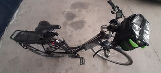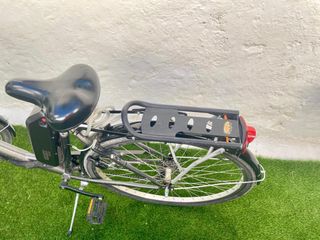 Bicicleta de paseo convertida a eléctrica, tiene 5 velocidades y luz trasera y delantera mediante dinamo, pata de cabra, cesta delantera y portabultos trasero, tambien con silla portaniños hasta 23 kilos, frenos v-brake, muy cómoda para llevar a niños con el pedaleo asistido.