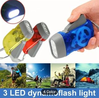 Tinternas de mano LED, ideales para acampar. Son de plástico, resistentes y vienen en colores surtidos (amarillo, rojo y azul). Funcionan con dinamo. - Tres linternas LED. - Colores: amarillo, rojo y azul. - Sistema de dinamo. No necesita pilas ni cargar con electricidad.