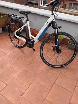 Bicicleta eléctrica BH E-Motion en color blanco con detalles en azul. Ideal para desplazamientos urbanos y paseos. Funciona muy bien, batería reparada . Pero se averió el display Freno de disco Buje dinamo Luces horquilla con bloqueo La bici está bien, lo merece - Cuadro de aluminio. - Ruedas de 28 pulgadas. - Portaequipajes trasero.