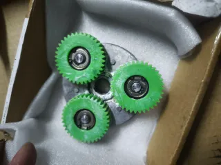 Conjunto de engranajes para motor de bicicleta eléctrica. - Tres engranajes de color verde. - Componentes metálicos centrales.