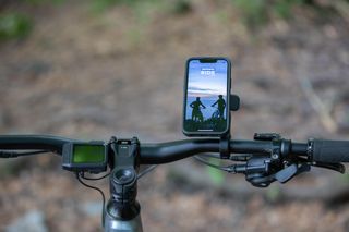 Bicicleta eléctrica de montaña con cuadro gris y detalles en negro. Incluye bolsa delantera y casco. - Cuadro de aluminio. - Ruedas todoterreno. - Sistema de suspensión delantera. - Bolsa de manillar negra. - Casco de seguridad.