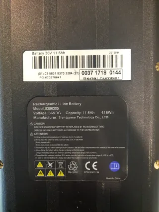 Batería recargable de Li-ion para bicicleta eléctrica. Btwin decathlon - Modelo: 8386305 - Voltaje: 36VDC - Capacidad: 11.6Ah - Energía: 418Wh - Fabricante: Trendpower Technology Co., LTD - Fabricado en China