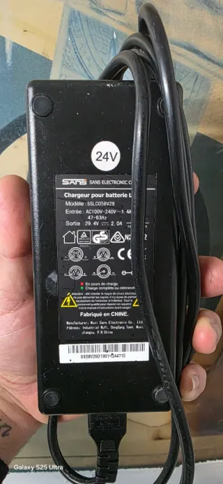 Cargador 24v de corriente SANS para baterías de litio. Perfecto funcionamiento. - Modelo: SSLC058V29 - Entrada: AC100-240V, 1.4A, 47-63Hz - Salida: 29.4V, 2.0A - distribuido por Decathlon