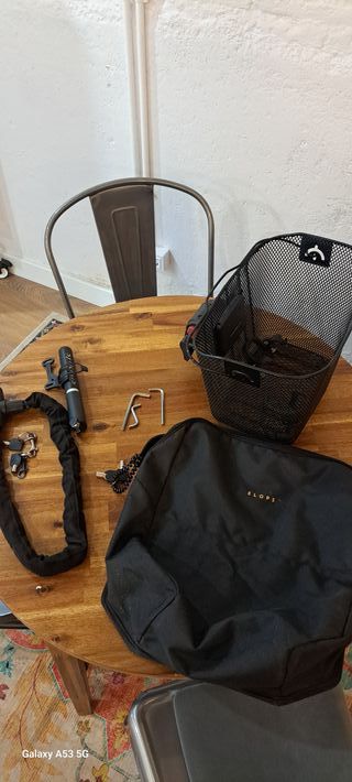 Bicicleta eléctrica de decathlon, solo usada por seis meses, todo en buena condición excepto el asiento. Además lleva guardabarros, caballete y porta botella , que compré aparte.
