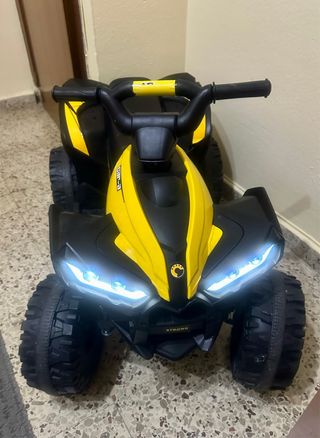 Quad electrónico infantil de color amarillo y negro. Diseñado para la diversión de los más pequeños. - Diseño deportivo. - Ruedas todoterreno. - Luces delanteras LED.