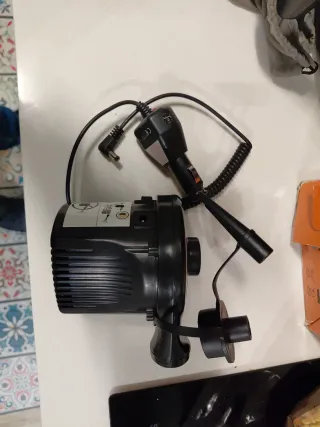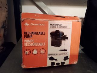 Bomba de aire recargable Quechua, ideal para inflar artículos deportivos. Es ligera y fácil de transportar. - Bomba de aire recargable. - Incluye varios adaptadores. - Compacta y en buen estado. - Toma carga para mechero.