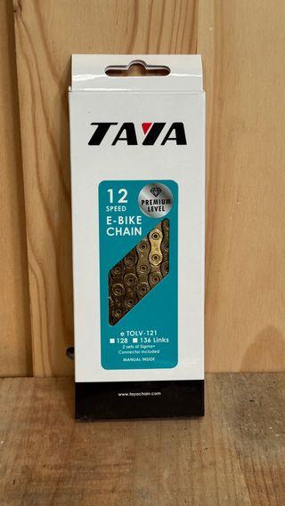 producto nuevo. Cadena para bicicleta eléctrica TAYA, modelo eTOLV-121, de 12 velocidades. Es dorada y tiene 136 eslabones. Incluye conector. - Nueva. - Diseño ligero. - Tratamiento anti-óxido. - Pasador macizo. - Puente inclinado. - Semi-eslabón.