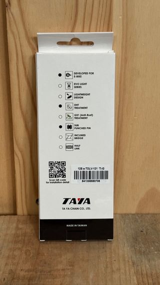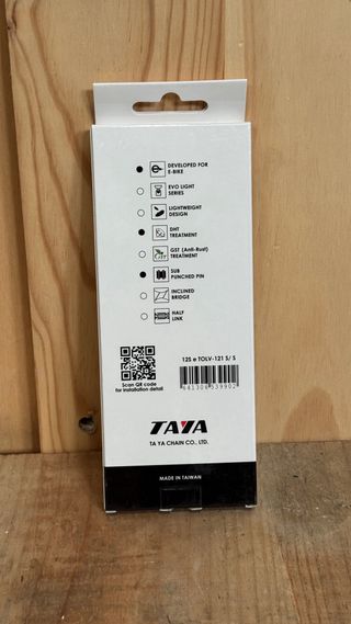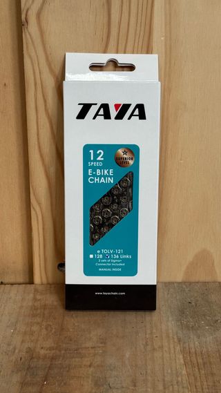 producto nuevo. Cadena TAYA eTOLV-121 para bicicleta eléctrica de 12 velocidades. Incluye 136 eslabones y conector. Es ligera y está diseñada para e-bikes. Tiene tratamiento anti-óxido (GST). El eslabón está inclinado. La cadena es de color plata y se ve en perfecto estado. Se incluye manual de instrucciones.