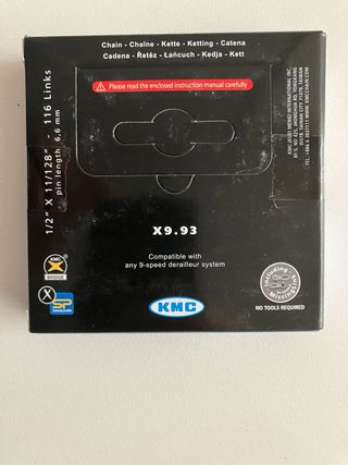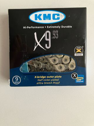Cadena KMC X9 de alto rendimiento, diseñada para 9 velocidades y con 116 eslabones. Producto original Caja sellada - X-bridge outer plate - Half nickel plated - eXtra Stretch Proof - KMC BRIDGE + Eslabón rápido ebike bicicleta electrica