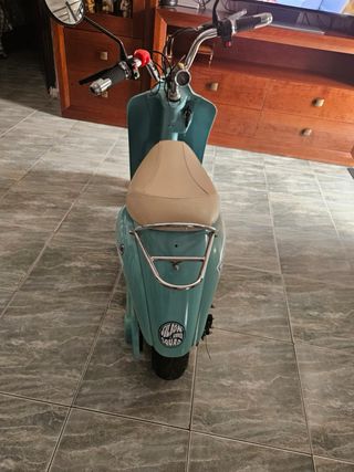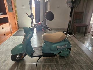 Moto eléctrica de estilo retro para niños azul claro, tipo vespa. Puede controlarla el niñ@ con el pedal o controlarlo un adulto mediante un mando. Tiene musica y puedes conectarle un pen con musica. La moto es recargable y la bateria dura bastante tiempo. Tiene algunos arañazos del uso, pero en general esta muy bien. Mi hijo la usado muy poco en la calle. Costó 120€.