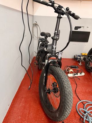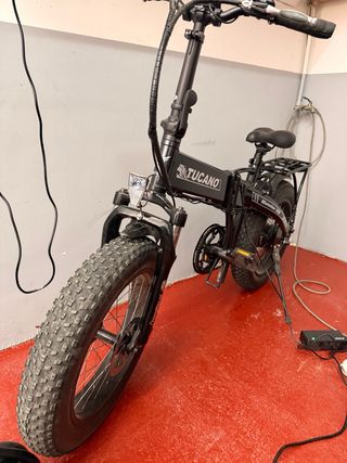 Bicicleta eléctrica Tucano de estilo plegable, ideal para desplazamientos urbanos. - Marco de color negro. - Ruedas anchas tipo fat bike. - Sillín negro. - Portaequipajes trasero. -440 km solamente. - Muy muy poco usada. -Bastante bien conservada.