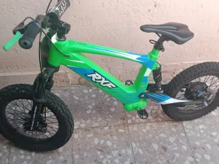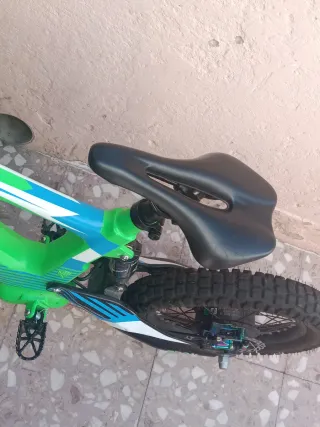 Bicicleta eléctrica con un llamativo diseño en color verde y detalles en azul de 16. - Cuadro robusto. - Ruedas todoterreno. - Sillín negro. - Manillar con puños negro - Amortiguador trasero de gas - pinza trasera hidráulica - con menos de 10 carga de uso Y mantiene su garantía la bicicleta no tiene ni un año mejor ver en persona. -Personas no mareantes