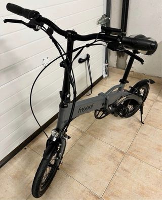Se vende por falta de uso. Con una funda para el sillín de regalo. NO SE HACEN ENVÍOS A recoger por la zona del metro Joanic y Verdaguer. Bicicleta eléctrica plegable de color gris de la marca Freeel. Diseñada para ser compacta y fácil de transportar. - Marco de color gris. - Ruedas de 12 pulgadas. - Sillín negro. - Manillar plegable.
