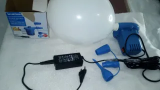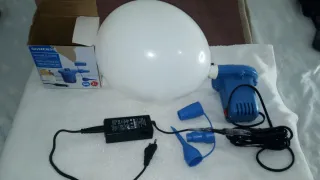 Inflador eléctrico SilverCrest para hinchar objetos de forma rápida y sencilla. Incluye varias boquillas para diferentes usos y tamaños. Para inflar globos o piscina. Originalmente era para coche pero se le ha adaptado un cargador para que pueda usarse a nivel doméstico. - Color azul. - Viene con caja original.