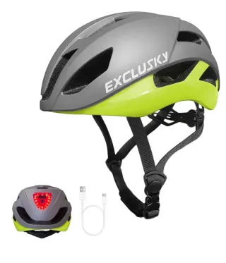 Casco de bicicleta Exclusky para adultos, diseñado para ciclismo de montaña (MTB) y carretera, así como para patinetes eléctricos. - Carcasa exterior de policarbonato (PC) o PVC duradero. - Espuma interna de poliestireno expandido (EPS) para absorber impactos. - Certificado según los estándares de seguridad EN 1078 y CPSC. - Luz trasera LED recargable por USB con varios modos de iluminación. - Ligero y con sistema de ajuste de dial trasero.
