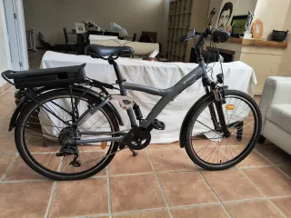 Bicicleta eléctrica BTWIN en color gris, en excelente estado. - Cuadro de aluminio. - Ruedas de 28 pulgadas. - Batería integrada en el portabultos trasero. - Suspensión delantera.