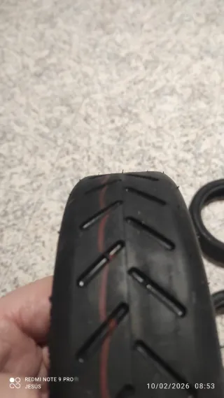 Se venden tres ruedas para patinete eléctrico. Son de goma negra y están listas para ser instaladas. - Incluye tres unidades - Material: Goma. - Color: Negro. - una de las ruedas con cámara ya