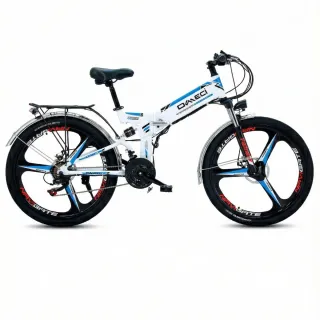 Bicicleta plegable con un diseño moderno en blanco y detalles azules. - Marcas Omeci - Potencia 400 W - Batería 10Ah - Autonomía 40 km - Tipo de accamulator LiIon - Tensión de alimentación 48V - Tipo de motor sin escobillas - Marca de transmisión Shimano - Transmisión 27 velocidades - Amortiguadores Delantero + Trasero - Tamaño de las ruedas 26" - Tipo de aplicación Urbano, montañoso - Pantalla LED - Material del marco Aleación de aluminio - Crecimiento máximo del usuario 165-185