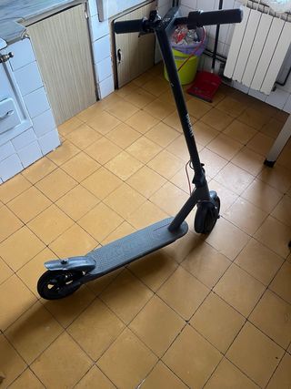 Patinete eléctrico de color negro, ideal para desplazamientos urbanos. Cuenta con un diseño moderno y funcional. Tiene sus marcas de uso.