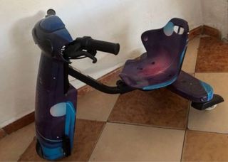Triciclo eléctrico con un diseño llamativo en tonos morados y azules. - Asiento ergonómico. - Manillar con puños negros. - Ruedas traseras con diseño. - Base delantera con detalles azules.
