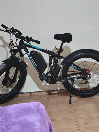 Bicicleta eléctrica E-BYCCO con ruedas anchas (fat bike). Lista para usar. - Cuadro robusto. - Batería integrada. - Suspensión delantera y trasera. - Neumáticos de gran tamaño.
