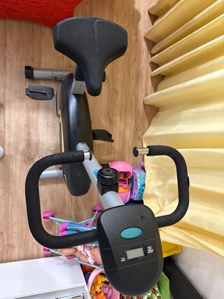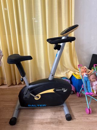 Bicicleta estática de la marca Salter con sistema magnético. - Diseño en color negro con detalles amarillos. - Asiento ajustable. - Manillar con agarres acolchados.