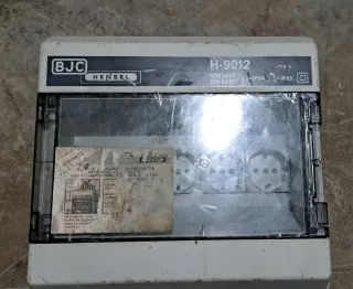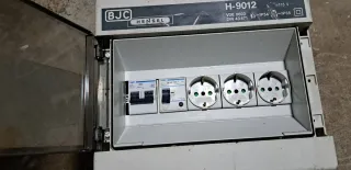 Cuadro eléctrico de la marca Hensel, modelo H-9012, con las marcas BJC y VDE. Tiene tres enchufes, un magnetotermico y diferencial incluido. - Modelo: H-9012 - Marca: Hensel BJC - Certificación: VDE 0603, DIN 43871 - Protección: IP54, IP65 - Voltaje: 415 V