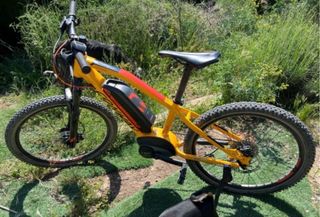 Bicicleta eléctrica doble suspensión customizada con kit eléctrico de 1500W, 2000W (potencia màxima) -Batería de 17,5Ah celdas LG. -Cuadro de aluminio rockrider adaptado para mayor capacidad de batería. -Frenos hidráulicos Shimano con discos de freno de 200mm -Doble suspensión de 120mm -Tija del sillín antishock. -Los 2 neumáticos nuevos (NO los de la imágenes) -Soportes de la batería de aluminio hechos con fresadora, superesistentes. -Plato motor de acero al carbóno. superesistente. -Grupo shimano 3x8. -Velocidad màx. para circuito 72km/h. - Peso solo 33kg. clave: Surron, Talaria, Stark, Segway, Xiaomi, Yamaha, Focus, Sur-ron