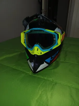 Casco con gafas para bicicleta o patinete eléctrico. Diseño moderno y llamativo. - Gafas de color amarillo y azul. - Diseño multicolor en el casco. - Talla: L