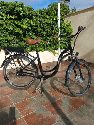 Bicicleta eléctrica de color negro, con un diseño elegante y cómodo. - Marca: Tucano - Color: Negro - Sillín marrón - Portaequipajes trasero. La batería se la acaban de poner nueva, con su garantía.