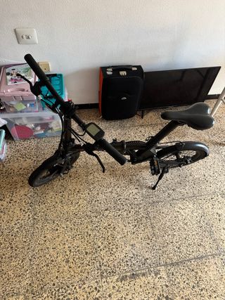 Bicicleta eléctrica plegable en color negro. Ideal para desplazamientos urbanos. - Diseño compacto y fácil de almacenar. - Ruedas de tamaño reducido. - Sillín ajustable en altura. Esta prácticamente nueva en perfectas condiciones y sevende porque la compré demasiado grande para mi hijo de 10 años Funciona perfectamente y corre demasiado para mi hijo usada solo unpar de beces están astas las ruedas limpias intactas core entre 30,40/km. Y agua asta 125.kl ,trae su cargador y una inchador y un super candado de código de seguridad.