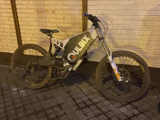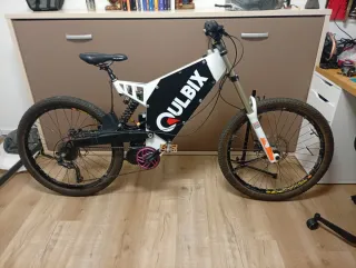 Bicicleta eléctrica Qulbix con potente motor banfang bbshd modificado. Lleva cambiada la centralita por una vesc sacando 4000w. Batería de 60v 20ah o 52v 40ah( tengo que probar está última) cuadro qulbiw q72r con suspensión de descenso. Frenos magura mt4. Próximamente batería de 72v 35ah. Tengo que terminar de ajustar alguna cosa. Acepto cambio por algo de mi interés
