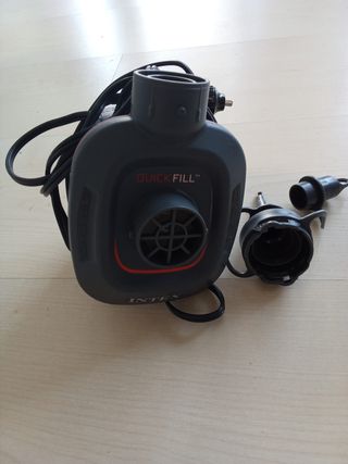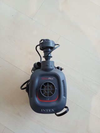 Inflador eléctrico Quick Fill de INTEX, capacidad 650 litros/minuto Incluye 3 boquillas de conexión adaptables a cualquier válvula Diseño ligero, con conexión al encendedor del coche (250 cm), uso exterior Dispone de botón de encendido y apagado para su funcionamiento Opción de inflado y desinflado de hinchables en pocos minutos