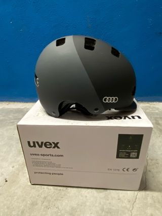 Casco de la marca Uvex con diseño inspirado en Audi. - Color gris oscuro y gris claro. - Logo de Audi plateado. - Cierre ajustable. - Ventilación superior. Talla 55-58