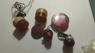 Lote variado de componentes eléctricos, incluyendo bombillas y pilotos luminosos para bicicletas antiguas. 10€ unidad. - Pilotos luminosos de color rojo. - Bombillas de diferentes tamaños. - Componentes con bases metálicas y de plástico.