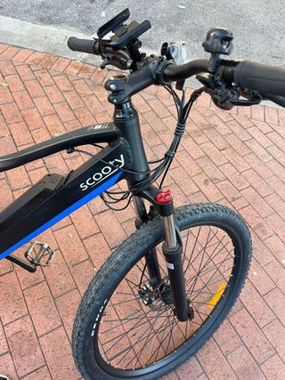 Bicicleta eléctrica Scooty con un diseño moderno y deportivo. - Cuadro de color negro con detalles en azul. - Ruedas todoterreno. - Horquilla delantera con suspensión.