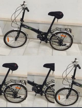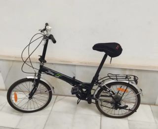 Bicicleta plegable en color negro, ideal para transportarla y guardarla fácilmente. Tiene un tornillo del guadabarros suelto - Cuadro plegable. - Ruedas de 16 pulgadas. - Portabultos trasero. Vendo por haberme comprado un patin electrico