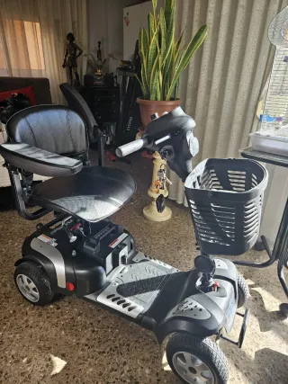 Scooter eléctrico modelo Venus 4 Sport, ideal para desplazamientos cómodos. - Diseño deportivo en color negro y plateado. - Asiento acolchado y reposabrazos. - Cesta delantera para almacenamiento. - Ruedas todoterreno. Usado durante 3 meses. Se vende en persona. Funciona con bateria, los cables y el cargador esta en buen estado.