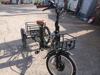 Triciclo eléctrico Biwbk en perfecto estado, listo para usar. - Diseño robusto y funcional. - Cestas delantera y trasera para carga. - Ruedas de buen tamaño para estabilidad.