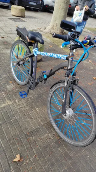 Bicicleta de montaña con un diseño llamativo. Cambios shimano. Se vende por regalo de patín eléctrico. Es de adulto - Cuadro de metal. - Ruedas todoterreno. - Sillín negro. - Frenos manuales.