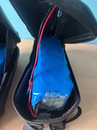 Batería de litio envuelta en plástico azul. Ba bien o cambio por otra cosa que me interese - Voltaje: 48V O se cambia por algo que me interese - Capacidad: 14Ah - Fecha de fabricación: 27/12/23